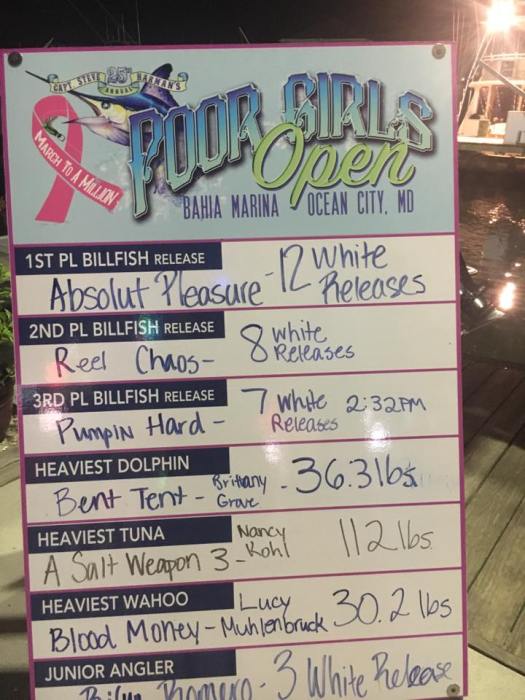 The Poor Girls Open is a ladies only billfish release tournament benefiting breast cancer research. There are also added entry levels for tuna and dolphin. This tournament was started by Capt. Steve Harman as a way for local waitresses and bartenders to have an affordable and fun competition while raising money for a very important cause. The tournament continues to grow with over 100 boats entering. Participation is not limited only to anglers as there are silent auctions, 50/50 tickets, T-shirts for sale, and other fun events helping to raise money for breast cancer research. In the past 3 years alone, the Poor Girls Open has raised over $100,000 that was donated to the American Cancer Society.